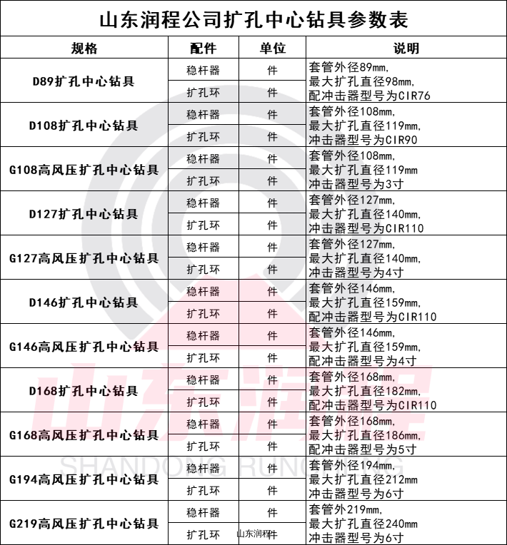 配套套管外径146mm,最大扩孔直径159mm,配合冲击器型号为CIR110或配4寸冲击器。