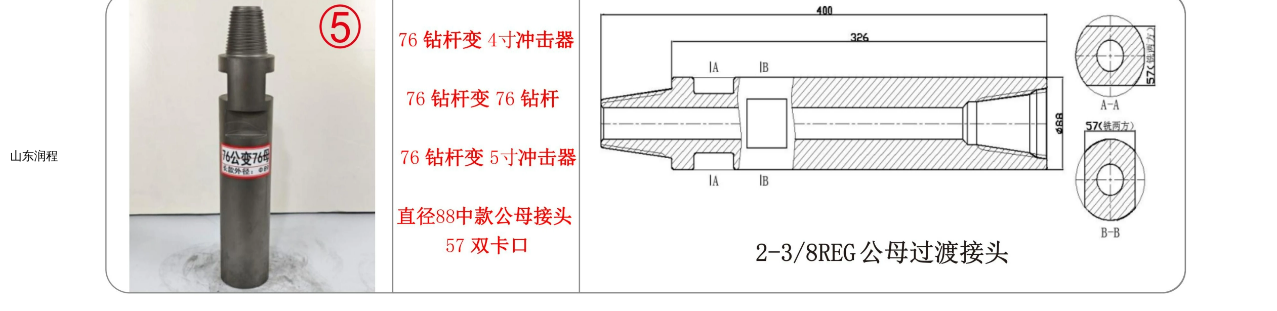 76钻杆变4寸冲击器,76钻杆变76钻杆,76钻杆变5寸冲击器,直径88中款公母接头57双卡口,2-3/8REG公母过渡接头。
