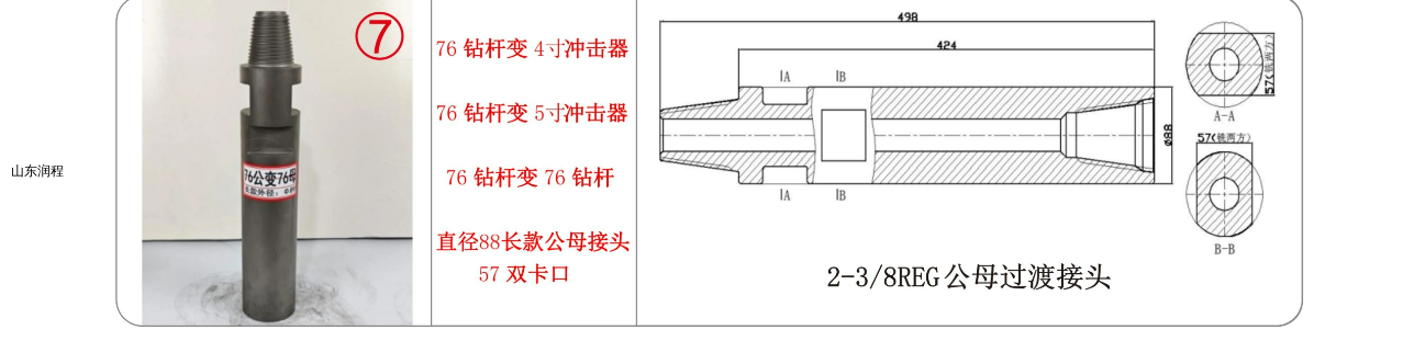 76钻杆变4寸冲击器,76钻杆变5寸冲击器,76钻杆变76钻杆,直径88长款公母接头57双卡口,2-3/8REG公母过渡接头。