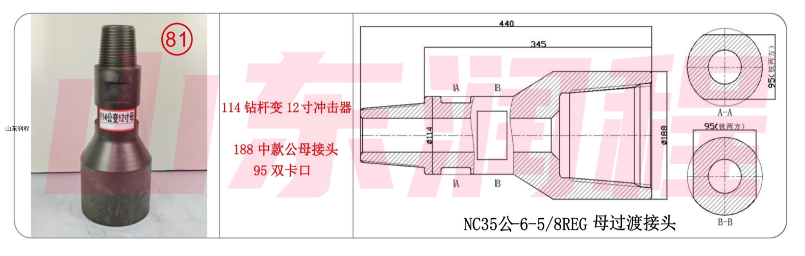 114钻杆变12寸冲击器,188中款公母接头95双卡口,NC35公-6-5/8REG母。