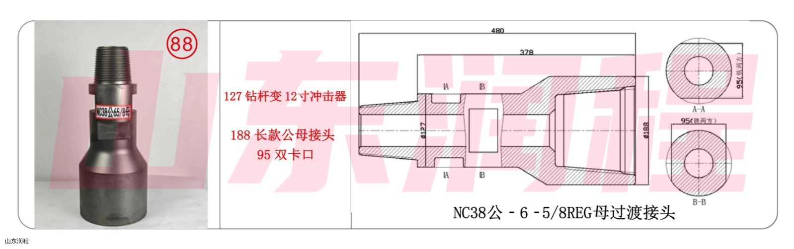 127钻杆变12寸冲击器,188长款公母接头95双卡口,NC38公-6-5/8REG母过渡接头。