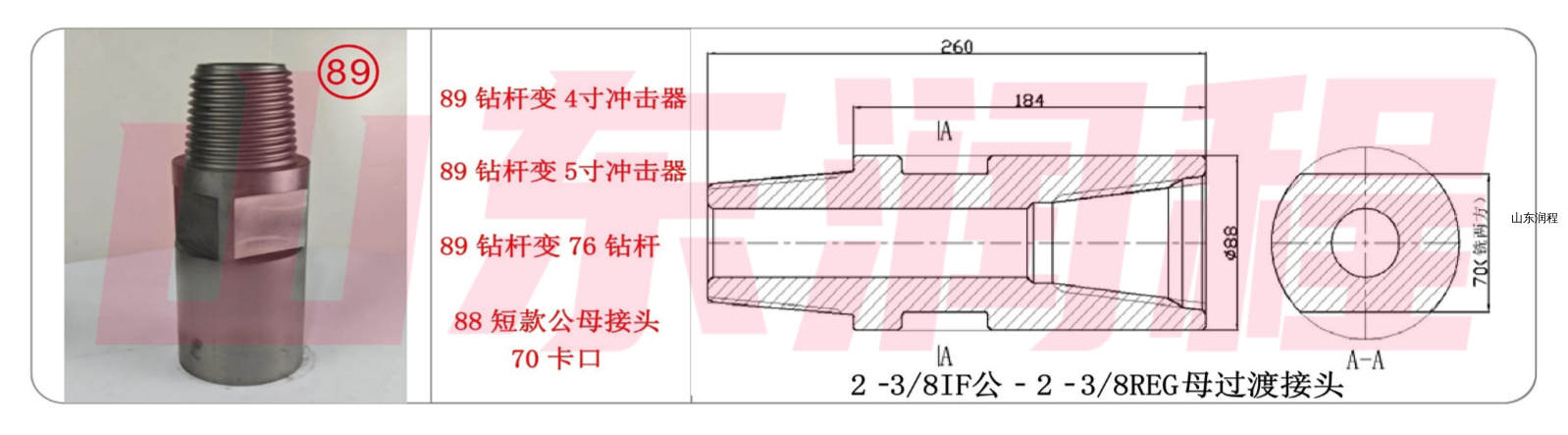 89钻杆变4寸冲击器,89钻杆变5寸冲击器,89钻杆变76钻杆,88短款公母接头70卡口,2-3/8IF公-2-3/8REG母过渡接头。
