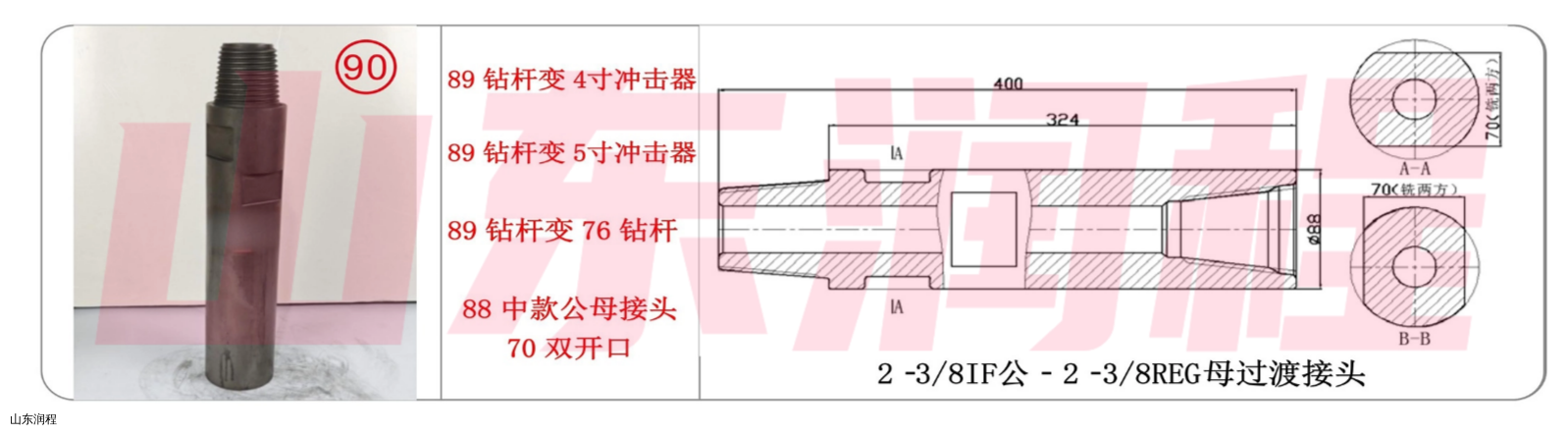 89钻杆变4寸冲击器,89钻杆变5寸冲击器,89钻杆变76钻杆,88中款公母接头70双开口,2-3/8IF公-2-3/8REG母过渡接头。