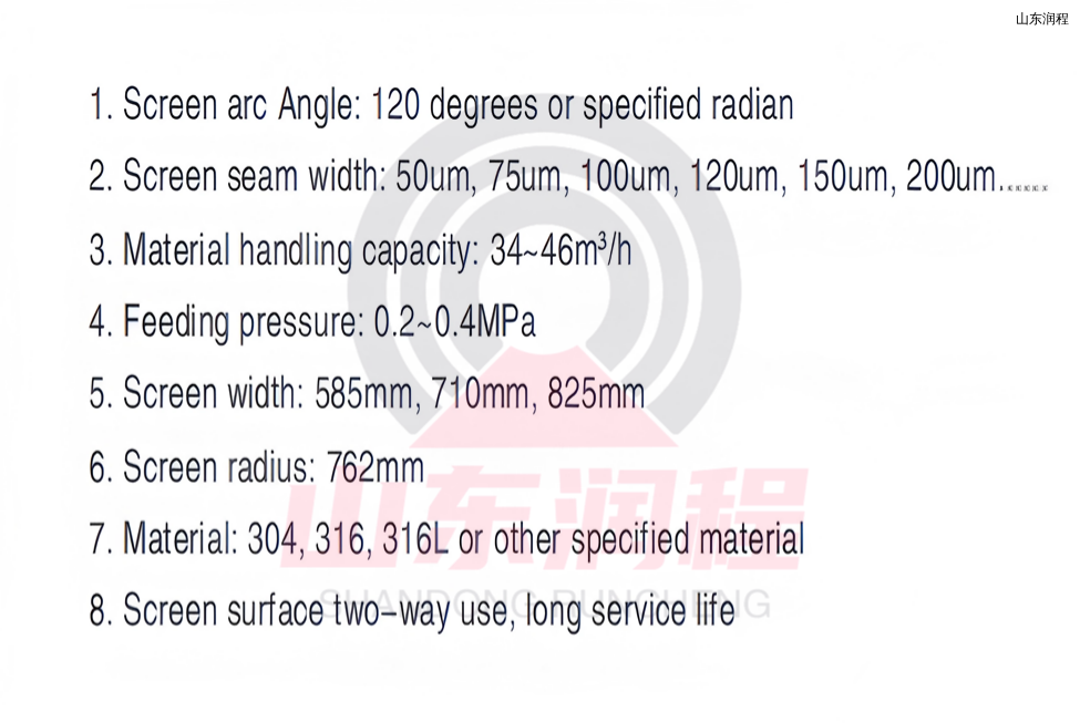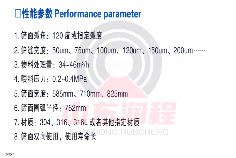 压力曲筛用于分离细小颗粒,浆料通过压力,不断输送到V形丝筛面上,液体穿过筛缝排出,固体颗粒则滑至筛面底部。使用寿命长,抗冲击效果好。适用于固液分离、淀粉工业的细纤维移除、食品加工、废水净化处理等行业。