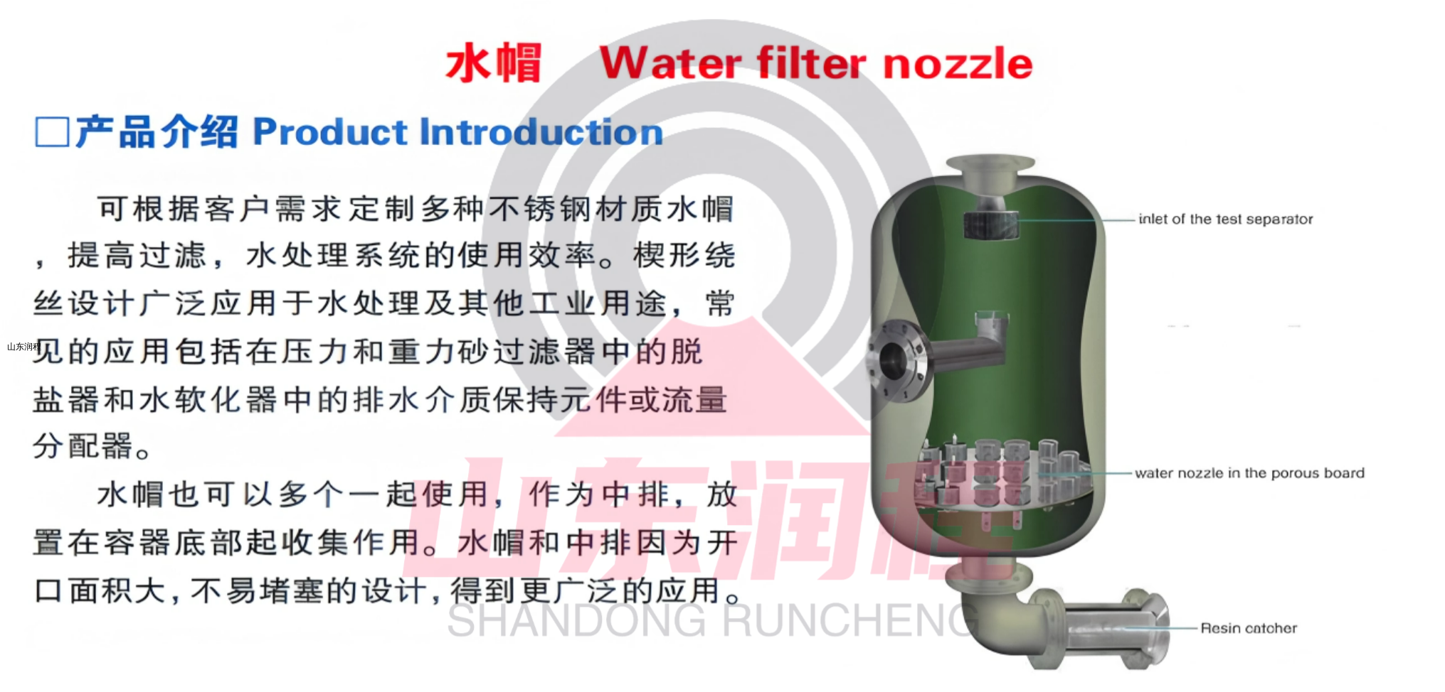 可根据客户需求定制多种不锈钢材质水帽,提高过滤,水处理系统的使用效率。楔形绕丝设计广泛应用于水处理及其他工业用途,常见的应用包括在压力和重力砂过滤器中的脱盐器和水软化器中的排水介质保持元件或流量分配器。