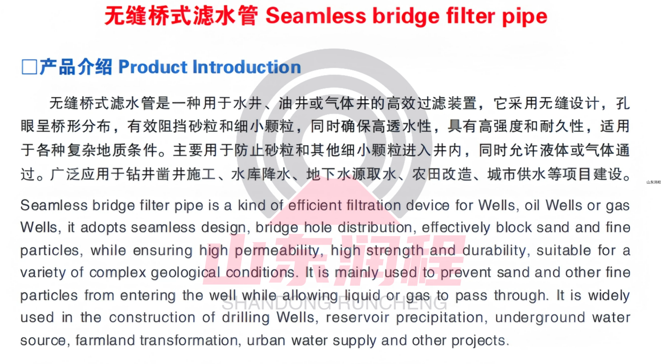 无缝桥式滤水管是一种用于水井、油井或气体井的高效过滤装置,它采用无缝设计,孔眼呈桥形分布,有效阻挡砂粒和细小颗粒,同时确保高透水性,具有高强度和耐久性,适用于各种复杂地质条件。主要用于防止砂粒和其他细小颗粒进入井内,同时允许液体或气体通过。