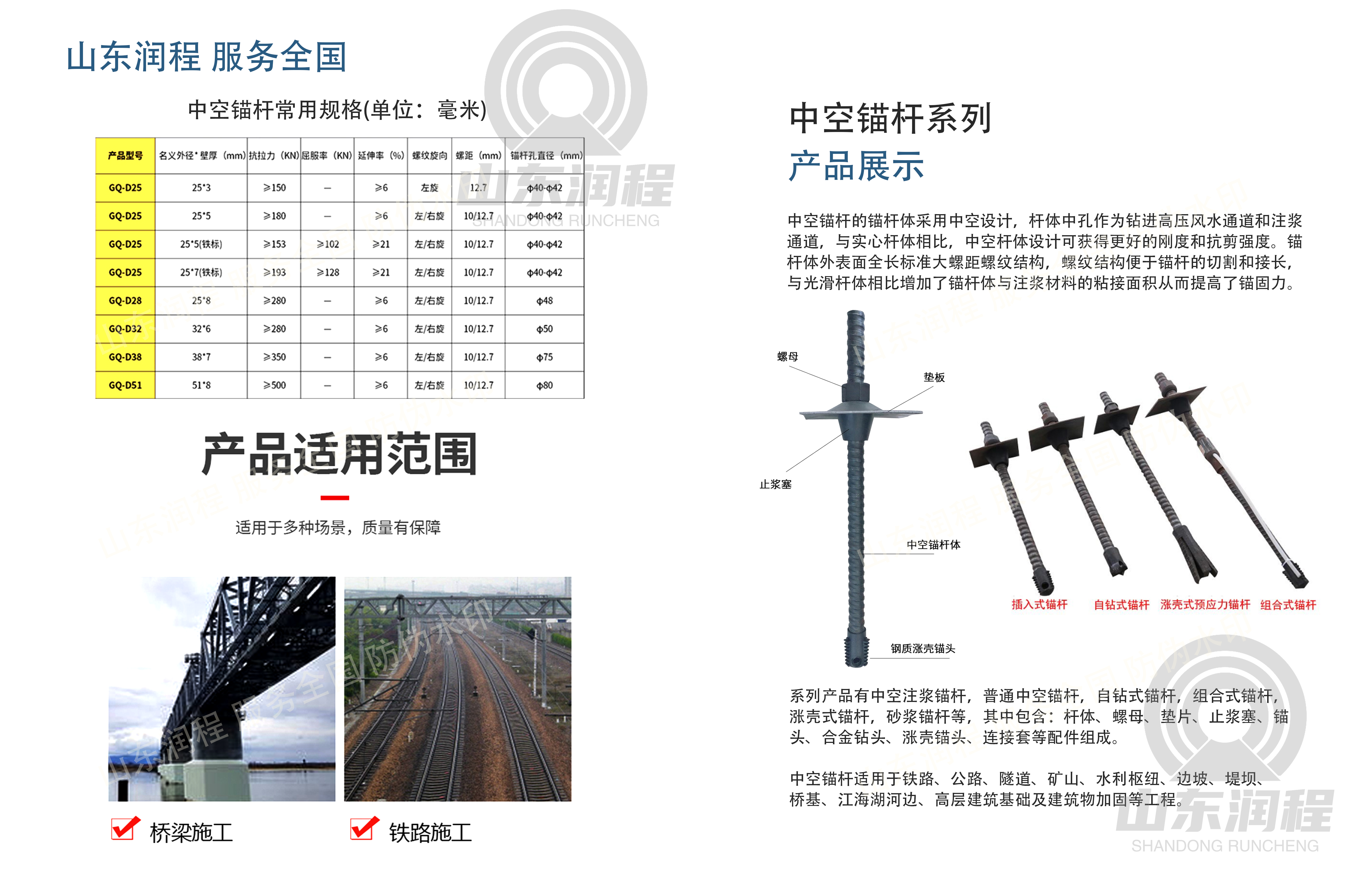 中空锚杆的锚杆体采用中空设计,杆体中孔作为钻进高压风水通道和注浆通道,与实心杆体相比,中空杆体设计可获得更好的刚度和抗剪强度。锚杆体外表面全长标准大螺距螺纹结构,螺纹结构便于锚杆的切割和接长,与光滑杆体相比增加了锚杆体与注浆材料的粘接面积从而提高了锚固力。