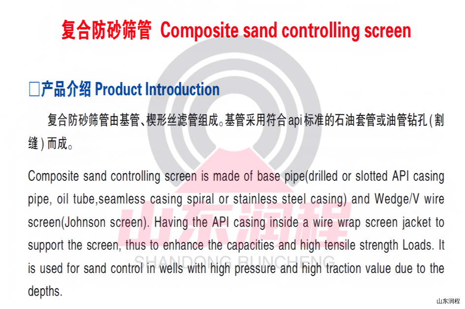 复合防砂筛管由基管、楔形丝滤管组成。基管采用符合api标准的石油套管或油管钻孔(割缝)而成。